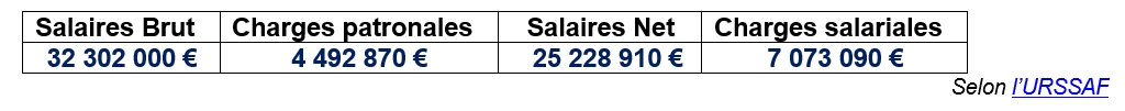 La Masse salariale est de 36 795 M€ dont 11 565 M€ pour financer la Sécurité Sociale